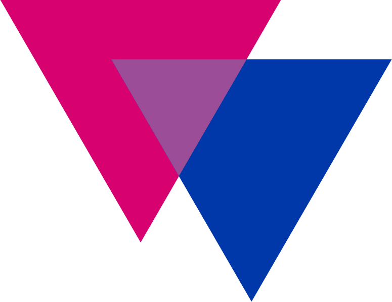 A symbol that consists of 2 upside down triangles, one colored pink and the other colored blue. These triangles intersect and create a smaller purple or lavender triangle where they overlap. The colors and symbols here represent bisexuality in the same way the flag goes.